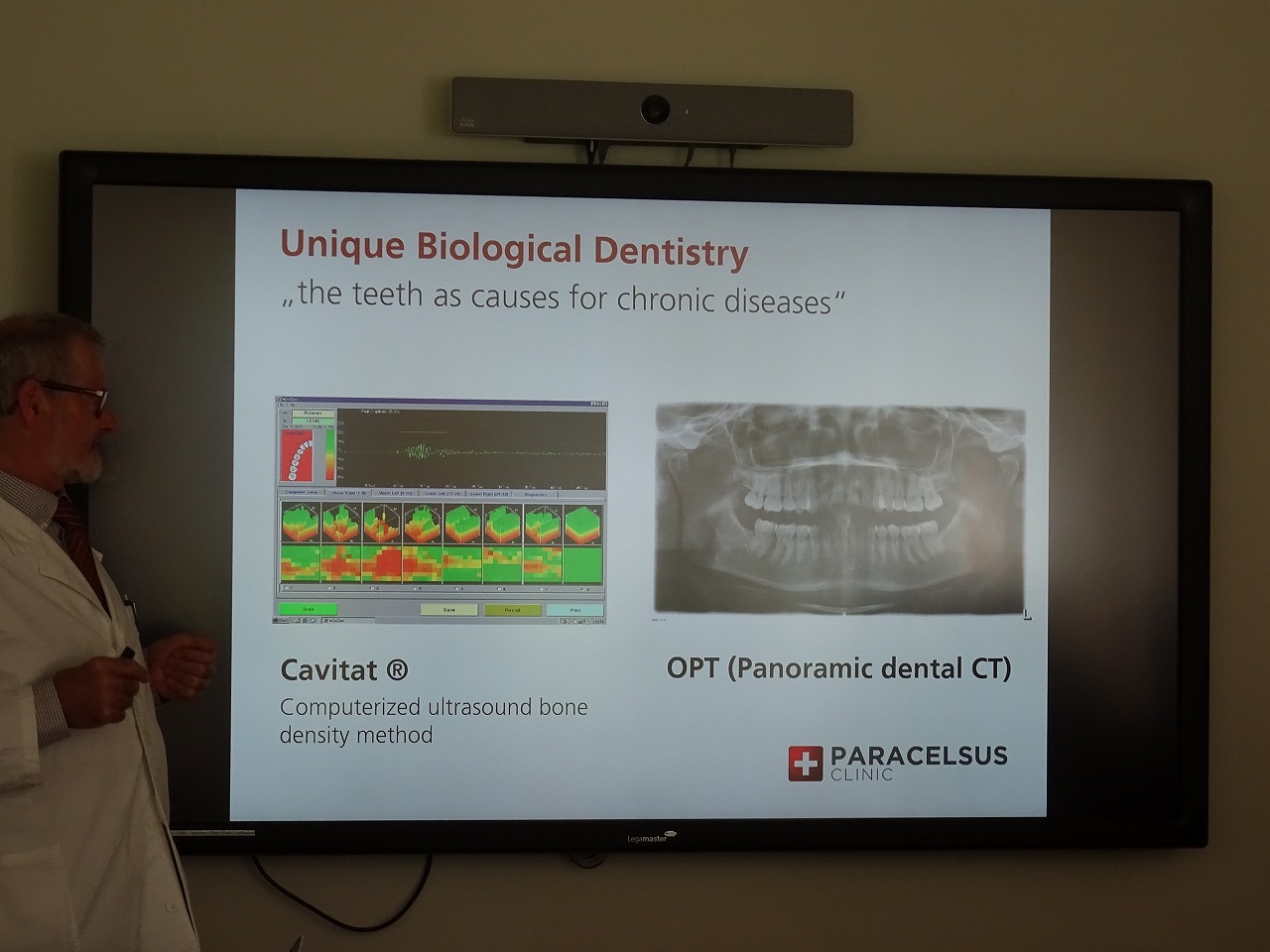 例えば肺または大腸の疾患でパラセルサスクリニックを訪れた患者さんが、レントゲンと口腔内視診で上顎両側第一第二小臼歯または下顎第一第二大臼歯に問題があれば、内科的な治療(一般的な西洋医学に加え相補伝統医療等の自然医療で)と同時に対応する歯牙の治療を行うことになります。DRラウの講義終了後、事前質問したのは私である事を明かし、およそ20年前に発行された国際歯科東洋医学会のパンフレットのDrグレディッチの写真をDRラウに見せたところ、大変懐かしいとの思いで眺めておりました。このことから日頃多忙なDRラウが我々の為に長時間にわたり貴重な時間を割いて講義、案内をしてくれたのは、私が事前質問をした中にDrラウの恩師であるDrグレディッチの話を聞いた日本人が来るから、と考えざるを得ないと自負しています。(写真下は医師であるDrラウが歯科の説明をしているところ)